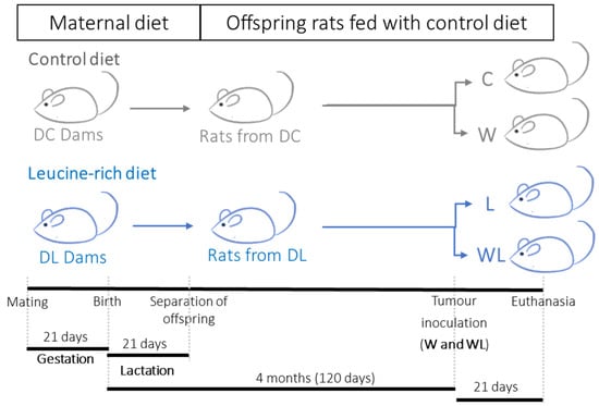 Schematic diagram of the experimental procedure. Legend: DC, dams fed control diet during gestation and lactation periods; DL, dams fed leucine-rich diet during gestation and lactation periods. Adult offspring were distributed into C, Control; W, Tumour-bearing animals; L, Group without tumour with a maternal leucine-rich diet; and WL, Tumour-bearing group with a maternal leucine-rich diet. For details, see the Materials and Methods section. DC (n = 3), DL (n = 3), and the final number of adult offspring rats (C, W, L, and WL) was 7–8 per group.