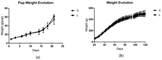 Offspring body weight evolution. (a) Pup weight evolution (g) during lactation until the weaning period (21 days old; litter size was adjusted to eight pups/dam). (b) Individual offspring weight evolution (g) after weaning until adulthood (before tumour inoculation; 21 to 120 days of life). C, offspring from a dam that was fed a control diet during its lifetime (n = 8); L, offspring from a dam fed the maternal leucine-rich diet and control diet after weaning (n = 8). The data were analysed using a t-test.