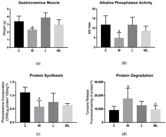 Tumour growth affected muscle protein synthesis and degradation and the phosphatase alkaline activity. (a) Muscle weight (g); (b) alkaline phosphatase activity, expressed as U/L*min; (c) muscle protein synthesis, expressed by the phenylalanine incorporation, CPM/µg protein*100 mg*h; (d) muscle protein degradation, expressed by tyrosine release, fluorescence/mg of protein*h. C, Control; W, Tumour-bearing animals; L, Group without tumour with a maternal leucine-rich diet; WL, Tumour-bearing group with a maternal leucine-rich diet. For details, see the Materials and Methods section. Values are presented as the mean ± SEM. n = 7, minimal animal per group. The data were analysed using a two-way ANOVA followed by the Bonferroni test to evaluate comparisons among groups. a p < 0.05, for comparison with the C group; b p < 0.05, for comparison with the W group.