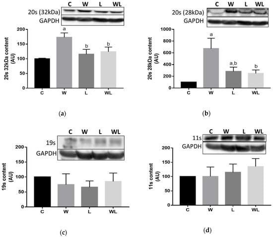 The relationship between protein degradation and the proteasome subunits 20S and 19S and the 11S regulatory particle were investigated (Figure 4). The 19S, and 11S expression (Figure 4C and D) was not different among the groups. When we investigated the 20S subunit (32 and 28 kDa) (Figure 4A and B), and we found an increase in the W group compared to the C group (W > C, p < 0.0001 for 32 kDa; and for 28 kDa W > C, p < 0.0001, L > C, p = 0.0236, C = WL, p = 0.0547). Additionally, maternal leucine supplementation led to modulation of the damage effect because the 20S subunit (32 and 28 kDa) expression in the WL group was lower than that in the W group (WL < W, p = 0.0017 and p = 0.0004, respectively).