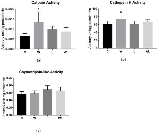 We evaluated the activity of cathepsin H, calpain, and chymotrypsin-like (Figure 5) enzymes related to muscle protein degradation. The W group had higher calpain (p = 0.0104; Figure 5A) and cathepsin H (p = 0.0306; Figure 5B) activities compared to the C group, indicating the impact on the calcium-dependent proteolysis pathway and lysosomal degradation, respectively. No differences were found between maternal leucine supplementation groups. For chymotrypsin-like activity (Figure 5C) no differences were found among the groups, in this protease related to the proteasome activity.