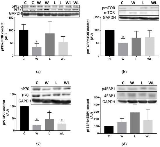 We investigated the mTOR pathway and the pPI3K/PI3K ratio was reduced in the W group compared to the C group (p = 0.0356; Figure 6A), but no differences were found between the L and WL group. The pmTOR/mTOR ratio decreased only in the W group (Figure 6B) (C vs. W, p = 0.0481) and the supplemented groups showed no difference. The pP70S6k/P70S6K ratio (Figure 6C), a downstream target of mTOR, showed a decrease in the W group compared to the C group (p = 0.0056), and the L group showed lower activation compared to the C group (p = 0.0410), but there was no difference between the L and WL groups (Figure 6C). Additionally, there was no difference in the p4EBP1/4EBP1 ratio (Figure 6D), another downstream protein of the mTOR pathway, among the groups.