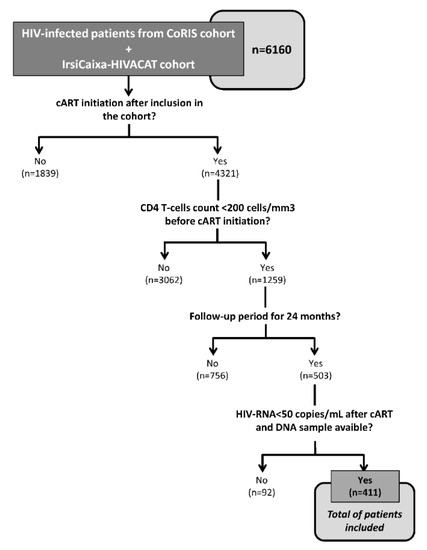 We performed a retrospective study in 411 HIV-infected patients starting cART included in two different cohorts: The majority of patients came from the Spanish AIDS Research Network cohort (CoRIS); the rest of the patients came from the AIDS Research Institute IrsiCaixa-HIVACAT, Institut de Recerca en Ciències de la Salut Germans Trias i Pujol (Barcelona, Spain) cohort. All subjects provided informed consent to participate in the study, and the study protocol was approved by the Fundación Jiménez Díaz Ethics Committee in concordance with the Declaration of Helsinki (approval date: 26 May 2015; record number: PIC 52/2015_FJD). The inclusion criteria were: (i) Naïve for cART at inclusion in the cohort; (ii) plasma HIV-RNA > 200 copies/mL; (iii) starting cART with CD4+ T-cells count < 200 cells/mm3; (iv) complete viral suppression (plasma HIV-RNA < 50 copies/mL) for two years after starting cART; (v) regular follow up of CD4+ T-cells count and plasma HIV-RNA for two years after starting cART; and (vi) DNA sample available for genotyping (Figure 1). From a total of 6160 HIV-infected patients included in the CoRIS and HIVACAT cohorts, 411 patients meeting all the inclusion criteria were analyzed.