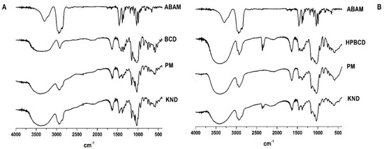 According to the FT-IR spectra shown in Figure 1A,B, the characteristic bands of βCD and HPβCD are predominant (axial deformation of the OH bond) around 3355 to 3300 cm−1. The spectra of ABAM-βCD obtained by PM and KND (Figure 1A) show similarities to the spectrum of βCD, which seems to indicate that ABAM spectrum has been hindered in both spectra of PM and KND [28]. However, the bands around the 3300 cm−1 region in the KND spectrum showed higher intensity than those of ABAM alone and PM. It seems that the KND method facilitated the inclusion of ABAM in the βCD cavity in which hydrogen bonds might have been formed between these two.