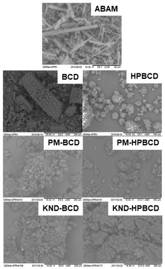 SEM is widely used to morphologically identify the formation of inclusion complexes due to the fact that such complexation usually involves changes in the surface, particle size and appearance of the parent drug [41]. When a drug is complexed within the CD cavity, the morphology of the obtained IC tends to be distinct from that of each individual component [42,43]. As shown in Figure 2, the morphological aspects of both ABAM- βCD and ABAM- HPβCD were markedly different from those of ABAM, βCD and HPβCD.
