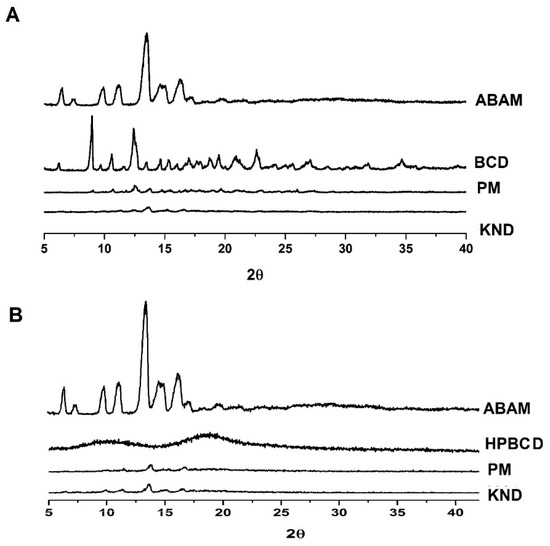 Similarly, ABAM-HPβCD prepared by PM and KND (Figure 3B) showed distinct diffraction profiles in comparison to those of ABAM and HPβCD. However, a suppression of the crystalline reflections of ABAM was observed, which seems to indicate an amorphization of the newly formed complex. Nevertheless, discrete diffraction peaks are still observed in the ABAM-HPβCD, which may result from the presence of the non-complexed ABAM.