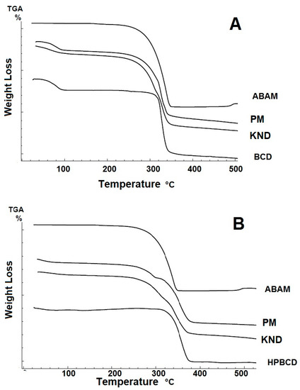 On the other hand, the DSC curve for ABAM-HPβCD (Figure 5B) shows that both PM and KND decreased the endothermic event related to the melting of ABAM, whose enthalpy values were 9.61 J/g and 5.70 J/g. This finding seems to indicate that some interaction between ABAM and HPβCD took place. In addition, a decrease in the water loss event of HPβCD is observed, which is another indication that complexation took place after the displacement of water molecules from the internal cavity of HPβCD.
