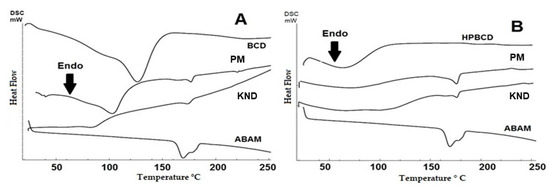 Differential scanning calorimetry (DSC) curves for ABAM, CDs and their respective ICs obtained with βCD (A) and HPβCD (B) by PM and KND.