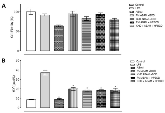 The MTT assay is commonly used to assess cell viability and proliferation by quantifying a blue-violet product called formazan crystal that is formed by enzymatic reduction in the cytoplasm of viable cells, which means that the higher its quantification, the greater the cell viability [50]. In this study, it was demonstrated that ABAM at the concentration of 20 μg/mL was able to inhibit the production of nitric oxide in LPS-stimulated macrophages J774 cells. However, considering that the inclusion complexes were obtained at a molar ratio of 1: 1 (ABAM:CD), we can infer that ABAM-CD has a higher NO● inhibition activity in comparison with ABAM alone due to the fact that its concentration is twice of that in the ABAM-CD system, which means that although the concentration of ABAM in each sample was 20 µg·mL−1, and its concentration in the ICs was around 10 µg·mL−1. In addition, the MTT assay showed that all the analyzed samples did not interfere significantly in the cell viability, which seems to indicate lack or very low toxicity.