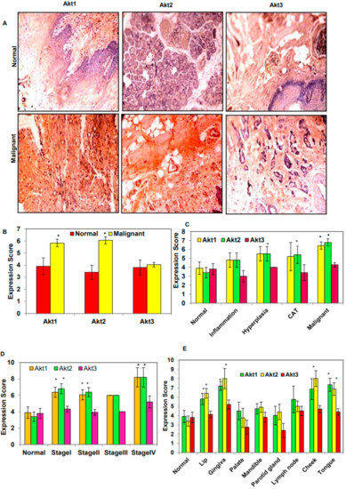 Expression of protein kinase B (Akt) isoforms in normal and malignant oral tissues through immunohistochemical analysis of the human oral cancer tissues. (A) Representative images showing the high expression of Akt1 and 2 isoforms in malignant tissues as compared to normal tissues at 10× magnification, (B) bar graph of the expression score for the normal (n = 10) and malignant (n = 70) tissues, (C) bar graph of the expression score for the normal tissues (n = 10), inflammation (n = 5), hyperplasia (n = 6), CAT (n = 5), (CAT: Cancer adjacent tissue), malignant tissues (n = 42), (D) bar graph of the expression score for the normal tissues (n = 10) and malignant tissues of stage I (n = 21), stage II (n = 15), stage III (n = 1), and stage IV (n = 5), (E) bar graph of the expression score for the normal (n = 10), lip (n = 15), gingiva (n = 5), palate (n = 4), mandible (n = 11), parotid gland (n = 5), lymph node (n = 4), cheek (n = 7), and tongue (n = 15). Data are expressed as the mean ± standard error (SE). * = p < 0.05 vs. Normal.