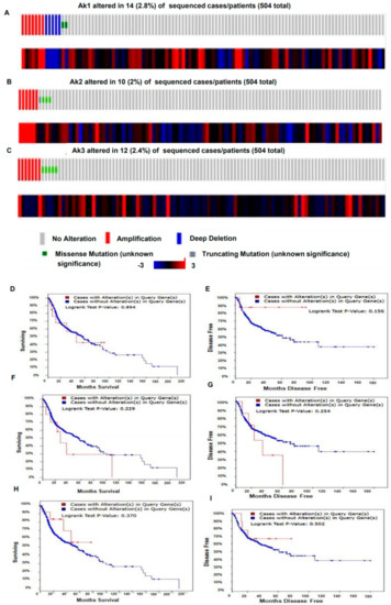 3.2. Genetic Alteration of Akt1 and 2 Isoforms Was Associated with Poor Overall Survival and Disease-Free Survival