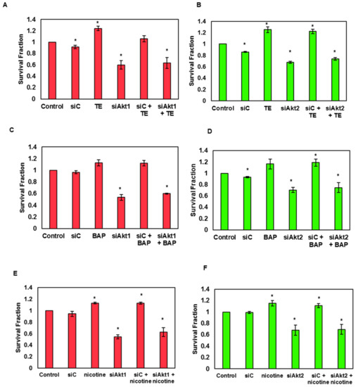 Clonogenic assay showing the survival efficiencies of SAS cells after knockdown of Akt1 and 2 isoforms following treatment with TE, BAP, and nicotine. Bar graph of clonogenic assay revealing the survival efficiencies of SAS cells after silencing of Akt1 and 2 isoforms following treatment with TE (A,B), BAP (C,D), and nicotine (E,F), (siC; Scramble control, siAkt1; siRNA for Akt1, siAkt2; siRNA for Akt2, TE; 50 ng/mL TE, 50 ng/mL BAP, 0.05 μM nicotine). Data are mean ± SE. *= p < 0.05.