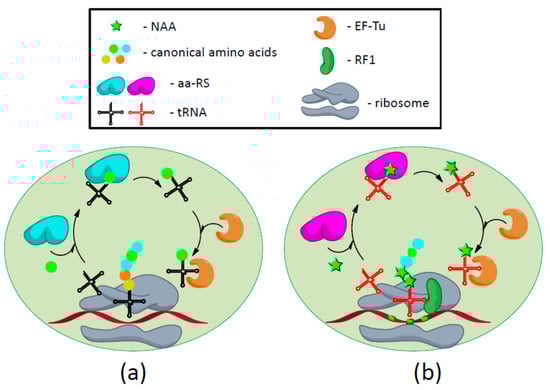 Schematic representation of expanded genetic code methodology. (a) Translation in E. coli cell: Endogenous aminoacyl-tRNA synthetases (aa-RS) (designed by cyan) charge tRNA (black colour) with cognate amino acids and aminoacyl-tRNA is transferred by elongation factor Tu (EF-Tu) to the ribosome. Proper interaction of mRNA codon and tRNA is required for the release of EF-Tu and peptide bond formation; (b) the methodology of genetic code expansion: NAA incorporation in response to amber stop codon is provided by supplying the organism with orthogonal aa-RS (violet colour) and suppressor tRNA (red colour). Suppressor tRNA is in competition with class I release factor (RF1).