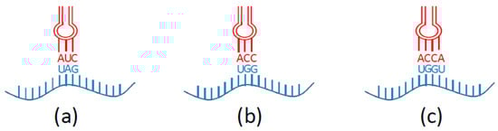 The existence of only three stop codons in the genetic code limits the theoretical number of NAAs that could be incorporated into recombinant proteins. Sisido and coworkers suggested overcoming this limitation with frameshift suppression based on the application of four- or five-base extended codon and a cognate suppressor [,,]. In certain species, some naturally occurring codons are rarely used and the amount of their corresponding tRNA is low. Rarely used sense codons, such as arginine (AGG) [,] or proline (CCC) codons of E. coli, can be used for direct NAA incorporation in proteins [] or for designing of extended codons and frameshift suppression (Figure 2b,c) []. In this approach, an mRNA containing an extended codon consisting of four or five bases is read by a modified aa-tRNA containing the corresponding extended anticodon, and a full-length protein containing NAA at the specific site is obtained. If the extended codon is read as a three-base codon by an endogenous tRNA, the reading frame will be shifted by one base that in turn leads to a premature encounter with a stop codon and early termination of protein synthesis [].