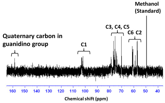 Guanidinylation was performed with 3.8 equivalents (equiv) of AP toward an amino group in COS at room temperature for seven days [9]. The product was isolated as a methanol-insoluble fraction at a 26.8% yield. Figure 1 shows the IR spectrum of the product. In the spectrum, the characteristic absorption peaks, attributed to the C=N stretching vibration and the NH bending vibration of guanidino groups [9], were observed at around 1725 cm−1 and 1590 cm−1, respectively. Figure 2 shows the 13C NMR spectrum of the product. In the spectrum, the signals, due to the quaternary carbon in the guanidino groups, are shown at around 159.3 ppm [9,21,22]. These results clearly indicate the production of GCOS. The degree of guanidinylation (guanidinylated units (mol)/total units (mol) × 100) was 66.3%, as estimated by elemental analysis (C/N = 4.22).