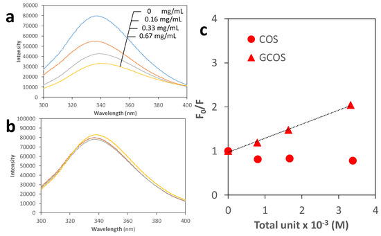 Fluorescence spectra (excitation wavelength: 275 nm) of 0.42 mg/mL BSA in the presence of 0, 0.16, 0.33, 0.67 mg/mL GCOS (0, 0.79, 1.64, 3.32 × 10−3 M, respectively) or COS (0, 0.81, 1.67, 3.39 × 10−3 M, respectively) in a 0.1 M Tris–HCl buffer (pH 7.4) (a or b, respectively) and their Stern–Volmer plots (c).