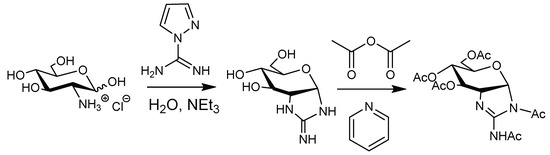 On the other hand, protection-free synthesis for making carbohydrate-related compounds has attracted great attention as it allows us to be released from the laborious protection–deprotection routes. The reducing end showing high reactivity is an attractive target to achieve a protection-free synthesis of valuable building blocks. The production of glycosyl amines [13], glycosyl azides [14], and glycosyl donors [15,16,17], and the immobilization of carbohydrate building block via reductive amination [18], by virtue of the high reactivity of the reducing end, are widely employed in carbohydrate chemistry. The development of protection-free synthesis for making building blocks that still require the protection–deprotection process is effective for developing medicines, agrochemicals, and functional materials. 2-[(Aminoiminomethyl)amino]-2-deoxy-d-glucose, having a cyclic guanidine structure on the reducing end, was expected as a catalytic cofactor analogue for the glmS ribozyme [19]. It is expected to have inhibitory activity toward chitinase/chitosanase because of the structural similarity to chitin/chitosan. However, there are no synthetic routes that do not involve protection–deprotection procedures.