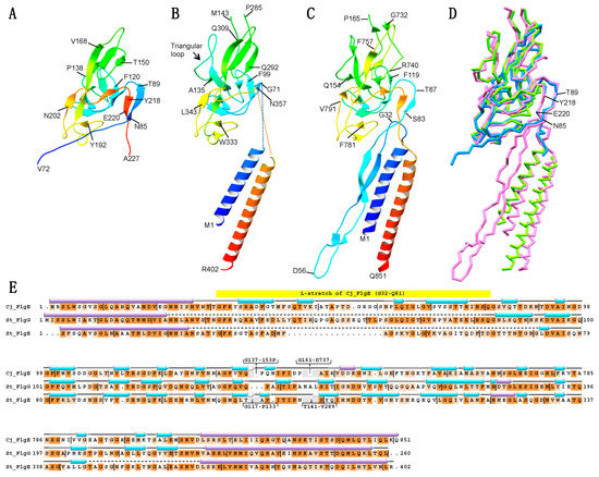 Structure of a core fragment of St-FlgG (FlgG20) from Salmonella typhimurium (St), FlgE from Salmonella typhimurium and FlgE from Campylobacter jejuni (Cj). Ribbon representation of the crystal structure of FlgG20 (A), the cryoEM structure model of D0 and D1 domains of St-FlgE (PDB ID: 3A69) (B), and the cryoEM structure of D0, l-stretch and D1 of Cj-FlgE (PDB ID: 5JXL) (C). The Dc region of the St-FlgE structure is not modeled due to the low resolution of the cryoEM map in (B). The models are color-coded from blue to red through the rainbow spectrum from the N to C terminus. (D) The superimposition of backbone models of FlgG20 (blue), St-FlgE (green) and Cj-FlgE (pink). The positions of N85, T89, Y218 and T221 of FlgG20 are indicated. (E) Structure-based sequence alignment of Cj-FlgG, St-FlgG and St-FlgE. Conserved residues are highlighted in dark orange (identical residues) or light orange (similar residues). Purple and cyan arrow indicates α-helix and β-strand, respectively. Molecular figures were drawn using MolFeat (Ver 3.6, FiatLux Corporation).