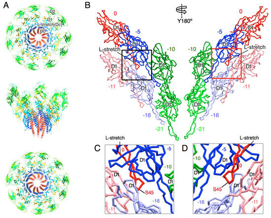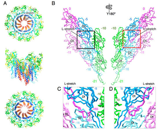 The previous cryoEM map of the St-hook also showed an unassigned elongated density between the D1 domain and the D0 helices [21]. The shape and position of the density is very similar to the density corresponding to the l-stretch of the Cj-hook or that of the St-rod. Therefore, we superimposed the D0-l-stretch-D1 structure of Cj-FlgE (PDB ID: 5JXL) on the St-FlgE model (PDB ID: 3A69) in the cryoEM density of the St-hook (EMDataBank ID: EMD-1647). The D0 helices and the l-stretch of Cj-FlgE were well fitted into the EM density with slight modification (Figure 3). The amino acid sequence alignment indicates that the l-stretch of St-FlgE is 18 residues shorter than that of Cj-FlgE (Figure 1E) [32]. Consistent with this, the density of St-FlgE corresponding to the l-stretch is shorter than the other two and terminates at the position expected from the sequence. Thus, we built the model of the Dc region based on the Cj-FlgE structure and constructed a full-length St-hook model. The subunit interaction mediated by the l-stretch is not as extensive as in the distal rod (Figure 2 and Figure 3). The l-stretch extends to the −5 direction and interacts with the inner surface of the D1 domains of the FlgE subunits in the −5 and −11 positions but not with the subunits in −10 and −16 positions (Figure 3B–D).