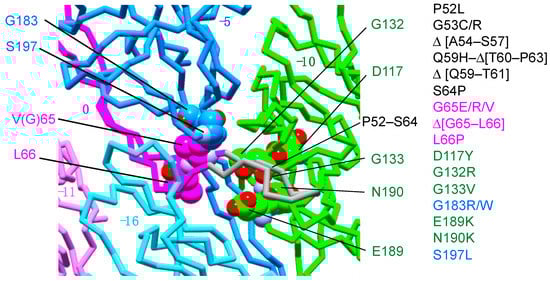 Polyrod mutation sites are localized around the tip of the l-stretch. The known polyrod mutation sites are mapped on the rod structure. Subunit at 0, −5, −10 positions are colored in magenta, blue, and green, respectively. The putative structure of the l-stretch tip of subunit 0 is shown in gray. The polyrod mutation sites except for those in the l-stretch tip are indicated by ball models. Oxygen and nitrogen atoms are colored in red and purple, respectively. The carbon atoms are painted by the same color as used for the subunits. The polyrod mutations [32] are listed to the right of the figure. Molecular figures were drawn using MolFeat (Ver 3.6, FiatLux Corporation).