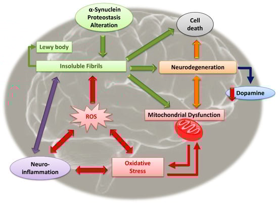 PD is a degenerative neurological disorder characterized by the onset motor symptoms such as tremors, muscle rigidity, slowness in movement (bradykinesia), and stooped posture (postural instability) [10]. Moreover, non-motor symptoms are also present, including disorders of mood and affect, apathy, anhedonia and depression, cognitive dysfunction and hallucinosis, sleep disruption, as well as complex behavioral disorders. PD affects 1–2‰ of the population at any time, and together with Alzheimer’s disease (AD), is one of the most common neurologic disorders [11]. PD affects approximately 1% of individuals older than 60 years, with an increment in the incidence of 5–10 times from the sixth to the ninth decade of life [12]. Environmental and genetic factors are both involved in the onset of PD, even if the framework of the disease is not completely elucidated [13]. Regarding the neuropathological mechanisms, the major evidence is the loss of dopaminergic neurons of the substantia nigra pars compacta and the locus coeruleus. The first is responsible for motor control, while the latter is responsible for various psychological effects. One of the most important consequences of neuronal degeneration is the reduction of dopamine (DA), responsible for numerous biological functions [14]. Furthermore, a brain affected by PD is characterized by the presence of Lewy bodies and Lewy neurites [15]. Lewy bodies consist of protein agglomerations (α-synuclein, parkin, and other proteins) embedded in the cytoplasm of dead neurons located in several different brain regions. Agglomeration of α-synuclein starts when soluble monomers initially form oligomers, then progressively continue to merge and thus form large, insoluble fibrils [16]. Beyond these two major clinical evidences, PD involves different molecular mechanisms, all related to each other and directly linked to the physiopathology of the disease, in a sort of vicious circle that exacerbate the neurodegeneration process (Figure 1).