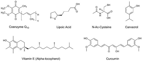 N-acetyl-cysteine (NAC, Figure 2) is an N-acetylated derivative of the sulphurated cysteine amino acid. The -SH group is able to actively contrast ROS, conferring antioxidant properties to the molecule [55]. At the same time, NAC and its analogues contribute to the physiological antioxidant activity by acting as a GSH precursor [56,57].
