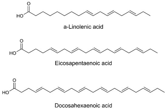 Omega-3 fatty acids have as main feature, a double bond, located three atoms far from the last methyl group, which is part of the backbone in their polyunsaturated structure (Figure 3). Omega-3 are present in certain foods such as cold-water fish (salmon) and fish oils, walnut, edible seeds and flaxseed oil, as well as dietary supplements in which fish oil is formulated as soft gel capsules. These types of fatty acids are important constituents of animal lipid metabolism, and they play an important role in the human diet and in human physiology, contributing to lower the levels of cholesterol and LDL (low-density lipoproteins) in the blood [79].