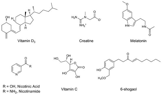 Vitamin C (ascorbic acid, Figure 4) has an important role in the human body since it is involved in numerous physiological functions. Moreover, it is an excellent antioxidant, useful in reducing the presence of ROS, lipid peroxidation, and oxidative stress [103]. The main food sources of vitamin C are vegetables and fruits, especially citrus fruits and paprika; in recent years more and more food supplements rich in vitamin C have emerged in the market.
