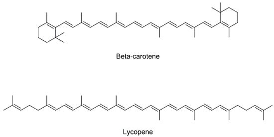β-carotene (provitamin A, Figure 5) is a vitamin A precursor, since it is composed of two retinyl groups, which can be broken down in the mucosa of the small intestine by β-carotene dioxygenase to form vitamin A. β-carotene can be found in yellow, orange, and green leafy vegetables and fruits (predominant in carrots, mango, maize, lentils, and spinach). As an antioxidant, it can scavenge singlet oxygen with very high efficiency, and it is also able to inhibit free radical reactions [110]. The very low toxicity of β-carotene and its potential efficacy in scavenging free radicals have led to several clinical trials assessing the antioxidant preventative activities, some of them also in the prevention and contrast to the PD disease.