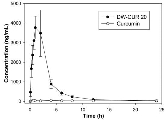 We conducted pharmacokinetic studies to determine whether the bioavailability of DW-CUR 20 was better than that of curcumin. The mean arterial plasma concentration-time profiles of curcumin after the oral administration of curcumin at doses of 50 mg/kg and of DW-CUR 20 at doses of 250 mg/kg (50 mg/kg as curcumin) in rats are shown in Figure 3, and the relevant pharmacokinetic parameters are listed in Table 1. The curcumin group showed generally low plasma concentrations of curcumin. The Tmax was not clear, and the concentration variations at each time point were fairly large. These results reflected low curcumin solubility, which limited absorption in the gastrointestinal (GI) tract, resulting in the low bioavailability of curcumin. In the DW-CUR 20 group, curcumin was absorbed rapidly in the rat GI tract after oral administration. Curcumin was detected in the plasma obtained at the first blood sampling time point (5 min). Peak curcumin concentrations occurred at 1–2 h, then the plasma concentrations gradually decreased, and curcumin was detected only at low levels after the 12-h time point. The Cmax and AUC values were 4135.0 ± 808.9 and 13,528.4 ± 3025.8, respectively. The mean AUC of the DW-CUR 20 group was more than 17 times higher than that of the curcumin group. Thus, the bioavailability of curcumin in DW-CUR 20 was at least 17 times greater than that of non-formulated curcumin.