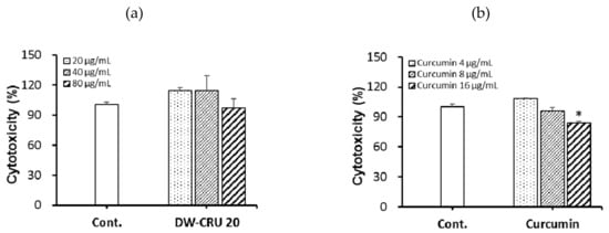 Cytotoxicity of DW-CUR 20 in HepG2 cells. Cell viability was determined using the EZ-CYTOX cell viability kit. Cells were pretreated with the indicated concentrations of (a) DW-CUR 20 (20, 40, and 80 μg/mL) or of (b) curcumin (4, 8 and 16 μg/mL) for 12 h. Data shown represent mean ± SD of triplicate experiments. * p < 0.05 vs. the control group.