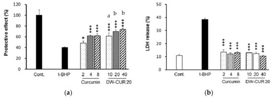 Protective effect of DW-CUR 20 against t-BHP-induced cell death in HepG2 cells. Cells were pretreated with the indicated concentrations of DW-CUR 20 (10, 20, and 40 μg/mL) or curcumin (2, 4, and 8 μg/mL) for 6 h in FBS-free medium, followed by addition of t-BHP (final concentration 1 mM). After 6 h, cells were washed twice with PBS then analyzed for cell viability using EZ-CYTOX cell viability kit (a). Cells were pretreated with the indicated concentrations (10, 20, and 40 μg/mL) of DW-CUR 20 for 6 h in FBS-free medium, followed by addition of t-BHP (final concentration 1000 µM). After 90 min, supernatants were collected for LDH analysis. LDH was analyzed using CytoTox96 non-radioactive cytotoxicity assay kit and calculated according to manufacturer’s protocol (b). Data are presented as the mean ± SD of three independent experiments. * p < 0.05, *** p < 0.001 vs. the t-BHP group. a p < 0.05, b p < 0.01 vs. the corresponding curcumin group.