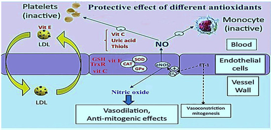 It has various functions including: The improvement of nitric oxide-dependent vasomotor function [87], the enhancement of NOS activity (NO production) and the consequent augmentation of NO bioavailability, the improvement of endothelial dysfunction and vasodilation, the inhibition of cyclooxygenase, the diminishing of cell–cell adhesion [88], and the reduction of the chain-carrying α-tocopheroxyl radical to inhibit LDL peroxidation [89]. It also recycles other endogenous antioxidants, such as vitamin E [90]; discourages leukocyte aggregation and adhesion to the endothelium [9]; and scavenges ROS such as superoxide, hydroxyl radicals, peroxyl radicals, and many non-radicals, such as nitrosating agents and hydrochlorous acid [9].