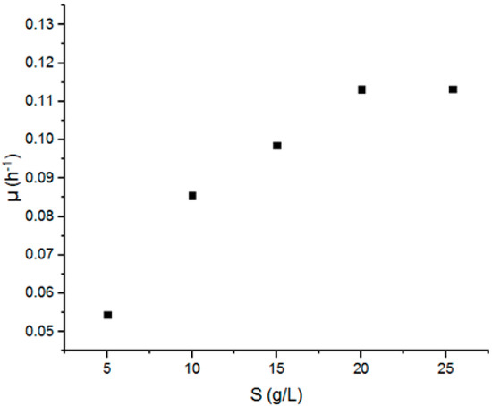 The variation of the specific growth rate μ as a function of the substrate concentration S (5–25 g.L−1).