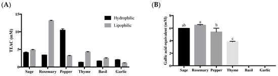 Antioxidant capacity (A) and total phenolic content of fresh condiment extract (1:1, hydrophilic: lipophilic) (B). Data presented are mean ± S.D. (n = 3). Kruskal-Wallis (non-parametric ANOVA) test ranks black pepper and rosemary to be the highest in hydrophilic, and lipophilic extracts, respectively. Columns sharing different alphabets are significantly different at least p < 0.05.