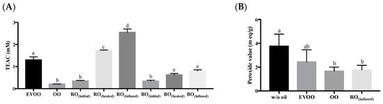 Antioxidant capacity of the cooking oils (A) and peroxide value of pan-fried salmon in cooking oils (B). Data presented are mean ± S.D. (n = 3). EVOO: Extra virgin olive oil; OO: Olive oil; RO(infused): Rosemary-infused oil; BO: Black pepper-infused oil; (initial): Oil collected immediately after addition of condiments; (heated): Oil collected after addition of condiments and heating for 10 min; (infused): Oil collected after addition of condiments, heating for 10 min, and infusion for 1 h. Columns sharing different alphabets are significantly different at least p < 0.05.