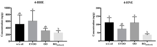Level of 4-HHE and 4-HNE in pan-fried salmon (ng of analytes per g of salmon meat). Data presented are mean ± S.D. (n = 6). w/o oil: without oil; EVOO: extra virgin olive oil; OO: olive oil; RO(infused): rosemary-infused oil. Columns sharing different alphabets are significantly different at least p < 0.05.