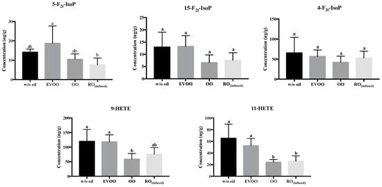 Concentration of non-enzymatic oxidized products of n-6 polyunsaturated fatty acid (PUFA) in pan-fried salmon samples (ng of analytes per g of salmon meat). F2-isoprostanes and HETEs are derived from arachidonic acid (ARA) and 4-F3t-IsoP is derived from n-6 DPA. Data presented are mean ± S.D. (n = 6). w/o oil: without oil; EVOO: extra virgin olive oil; OO: olive oil; RO(infused): rosemary-infused oil. Columns sharing different alphabets are significantly different at least p < 0.05.