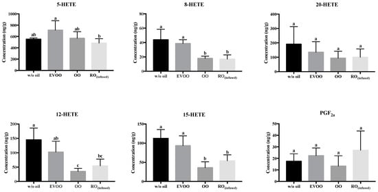 Concentration of enzymatic oxidized products of ARA in pan-fried salmon samples (ng of analytes per g of salmon meat). Data are presented in mean ± S.D. (n = 6). w/o oil: without oil; EVOO: extra virgin olive oil; OO: olive oil; RO(infused): rosemary-infused oil. Columns sharing different alphabets are significantly different at least p < 0.05.