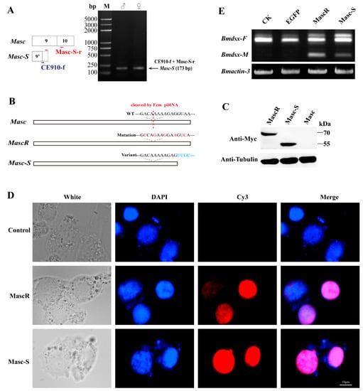 The lacking region of Masc-S was close to the Fem piRNA cleavage site, possibly affecting the cleaving event. To verify the above analysis, we designed specific primers to amplify Masc-S specifically in each sex of the silkworm. RT-PCR showed that Masc-S was expressed in the ovary and testis of the silkworm (Figure 2A). Moreover, we constructed the recombinant vector pSL1180-Myc-Masc-S, which can be over-expressed in silkworm cell lines. Similarly, the recombinant vectors, pSL1180-Myc-Masc (wild type) and pSL1180-Myc-MascR (the mutant Fem piRNA cleavage site) were constructed (Figure 2B). All the above recombinant proteins were labeled with Myc tags and expressed in silkworm female-specific ovary cells BmN (containing W chromosome with Fem piRNA). Western blot was applied to detect the expression of the target protein using the anti-Myc-tag antibody, and there was no Masc protein expression in the silkworm ovary cell line. Conversely, expression of MascR and Masc-S showed protein hybridization signals located at 70 kDa and 55 kDa, respectively (Figure 2C). The results indicated that Masc, due to its piRNA binding cleavage site, could not form a protein in BmN, but the splicing variant Masc-S could resist the cleaving of Fem piRNA in the female-specific cells, resulting in a truncated protein. Furthermore, immunofluorescence analysis showed that the Masc-S protein was present in the nucleus, but not in the cytoplasm (Figure 2D), which cellular location is the same as the full-length MascR protein. Furthermore, we checked sex-specific alternative splicing of Bmdsx. Results showed that male-specific splice type (Bmdsx-M) of Bmdsx was induced when Masc-S was over-expressed in BmN, and that expression level of Bmdsx-M induced by Masc-S is less than that by MascR. These results indicated Masc-S retained partial masculinizing activity (Figure 2E).