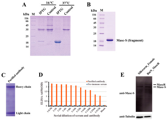 In order to detect the Masc-S protein in the silkworm, we performed the preparation of polyclonal antibody against Masc-S. Firstly, we cloned the fragment of Masc-S CDS into the pET-28a vector, and prokaryotic expression showed that the recombinant Masc-S (fragment) protein was over-expressed at 37 ℃ by using IPTG (Figure 3A). The Masc-S (fragment) protein was purified and the purity was more than 95% (Figure 3B). The recombinant protein was further confirmed as Masc-S by MS. Then, the purified Masc-S protein was applied to prepare the polyclonal antibody. Results indicated that the titer of the Masc-S antibody was more than 1:512000 (Figure 3C,D). Finally, we performed Western blot assay to detect the Masc-S protein in the silkworm by the polyclonal antibody. Results showed that the Masc-S protein is present in the female silkworm (Figure 3E).