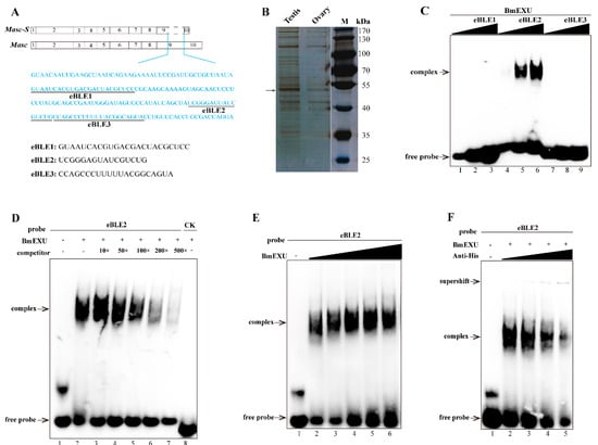 To address the issue of Masc-S generation, we employed the distinctive sequence between Masc and Masc-S, the lacking sequence of the latter, to perform an interactive protein down (Figure 4A). We performed SDS-PAGE to disperse the protein combined with the pretreated beads and stained with silver. A significant difference was found for a protein of approximately 52 kDa in the testis nuclear extract, as compared to bound proteins from male and female nuclear extracts (Figure 4B). Further, the result of LC/MS/MS revealed 14 candidate binding proteins (Supplementary Table S2). Interestingly, four unique peptides were detected, including residues 50 to 63, 127 to 139, 192 to 207, and 214 to 237, corresponding to the protein encoded by B. mori exuperantia (Bmexu). Previous studies showed that Drosophila exu protein functions in the germline and directs proper localization of the bicoid (bcd) mRNA by binding a preferred sequence of binding-like element 1 (BLE1) in the bcd 3’UTR during the earliest stages of oogenesis [21]. Based on the characteristics of the sequence of BLE1, rich in AU and AG, we searched for a similar element in the lacking sequence of Masc-S, and found three candidates, named as eBLE1, eBLE2, and eBLE3, which were designed correspondingly as Biotinylated RNA probes (Figure 4A). Subsequently, we constructed the over-expression vector of Bmexu (pSL1180-His-Bmexu) with His-tag to verify the relationship between BmEXU and eBLE1, 2, 3, by EMSA. Results suggested that the BmEXU protein could specifically bind to the eBLE2 probe in vitro (Figure 4C–F). Together, RNA-protein pull-down and EMSA indicated that BmEXU can specifically bind the probe eBLE2, which suggests that it has a possible role for BmEXU to bind different sections of Masc-S and full-length Masc to regulate alternative splicing of the Masc gene.