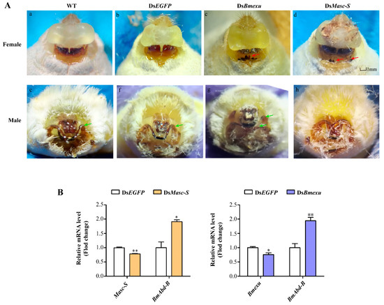 Effects of dsMasc and dsBmexu injection on the female external genital morphology and detection of the expression of Masc-S, Bmexu and Adb-B after dsRNA injection. (A) WT represents wild type, and dsEGFP injection was performed as the control group. The red arrow means that black protuberances appeared in ventral plates. The green arrow represents clasper. (B) Expression levels of Masc-S and Bmexu were down-regulated using dsRNA of Masc-S and Bmexu, respectively. Adb-B was up-regulated in both two experiment groups. Different numbers of asterisks above the standard error bars indicate significant differences (* 0.01 < p < 0.05, ** p < 0.01).