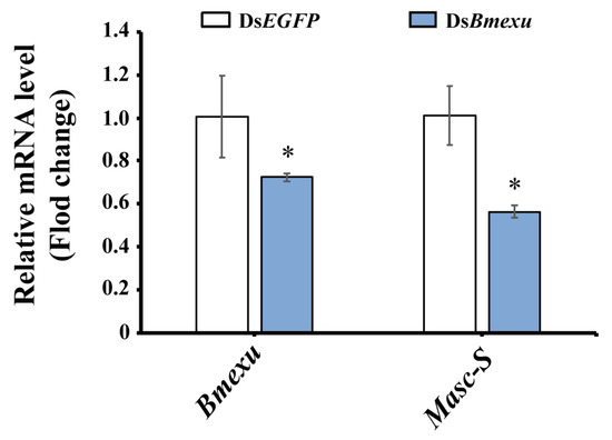 Expression level of Masc-S was down-regulated using dsRNA of Bmexu in the silkworm. The asterisk above the standard error bars indicates significant differences (* 0.01 < p < 0.05).
