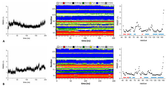Structure stability of KCTD5BTB (A) and KCTD13BTB (B) monomers throughout the MD simulations: Cα-based RMSD values of trajectory structures computed against the starting model, time evolution of the secondary structure content, Cα-based RMSF values computed in the equilibrated region of the trajectory (50–200 ns). The protein secondary structure elements are reported as bars (α-helices in blue and β-strands in red).