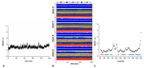 Structure stability of KCTD13BTB tetramer throughout the MD simulation: Cα-based RMSD values of trajectory structures against the starting model (A), time evolution of the secondary structure content (B), Cα-based RMSF values computed in the 50–150 ns trajectory region (C). The protein secondary structure elements are reported as bars (α-helices in blue and β-strands in red).