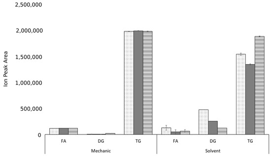 As expected, the lipids with the highest concentrations in the oils were TAGs, regardless of the extraction technique (Figure 1). This is not surprising because triacylglycerols have been widely reported as the main components of plant oils and animal fats [51,52,53,54,55]. By contrast, the concentration of DAGs was affected by the type of extraction, with solvent-based extraction producing much higher concentrations. As a result, the relative concentration of TAGs was lower when solvents were used for extraction. The total FA concentration did not exceed 5%, which is consistent with the acidity index results. There was no evidence of detectable monoacylglycerol content, although this is to be expected given the metabolic pathway of plant lipids [56], in which phosphatidic acid, which has a palmitic acid chain at the sn-2 position, is the precursor for the synthesis of DAGs. These DAGs then help form TAGs through the diacylglycerol acyltransferase action [56].
