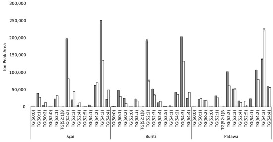 Comparison of the triglycerides (TG) content according to extraction method (mechanical extraction—grey bars; solvent—white bars) for açai, buriti, and patawa oils.