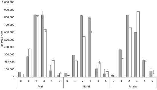 Comparison of fatty acid (FA) content according to extraction method (mechanical extraction—grey bars; solven—white bars) for açai, buriti, and patawa oils.