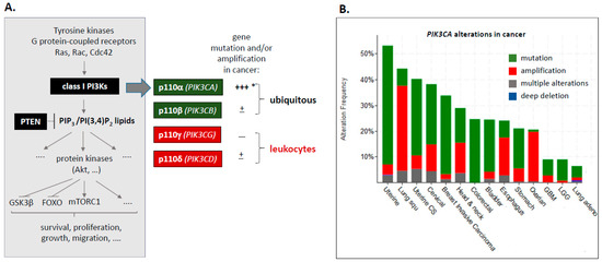 (A) Overview of class I PI3K signalling and genetic alterations in PI3K catalytic subunits in cancer. * Note that both wild-type and mutant PIK3CA alleles can be amplified in cancer [4]. A recent analysis showed that PIK3CA-mutant cancers frequently have more than one copy of the mutated PIK3CA gene and/or harbour a second PIK3CA variant [4]. (B) Frequency of PIK3CA alterations in a range of human cancers. Data are from cBioportal [5,6] (accessed June 2019).